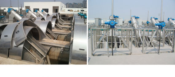 該設備由一系列圓環(huán)柵片組成的圓形楔筐作為柵面,與水平面成35°安裝在水渠中,當污水從格柵端頭流入柵筐內(nèi),大干柵隙的濾渣被攔截,沉積在柵筐內(nèi)表面,齒形刮板由電機驅(qū)動旋轉(zhuǎn),將濾渣刮至柵筐上方靠重力落下,同時電機反轉(zhuǎn),帶動齒形刮板倒轉(zhuǎn),并通過清渣板將截留的濾渣落入集渣槽里,濾渣通過中心螺旋輸送、擠壓、脫水后,由卸料口落入物料箱或輸送機進行外運處理。